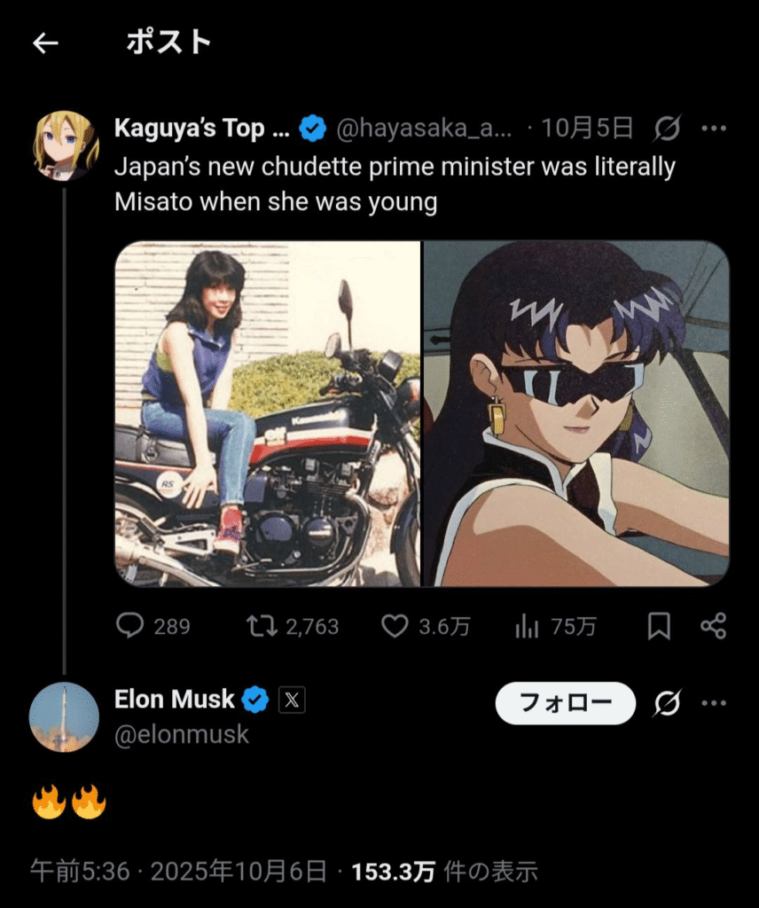 このツイートには、イーロンマスクさんも反応!エヴァンゲリオンのミサトさんに例えるなんて、本当にぴったりで的確過ぎます(笑)。