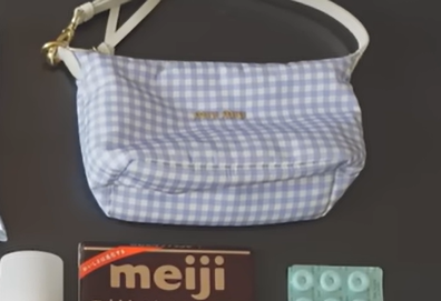 お菓子入れに使っているというミュウミュウのポーチ。ギンガムチェックが可愛い。